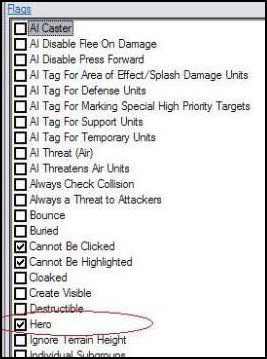 Then, there's one small thing to do: go to 'Unit - Flags' (at the bottom), and open it. Check 'Hero' and you're done there for now.