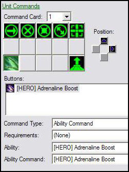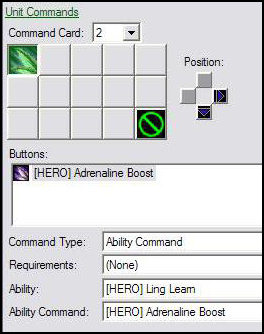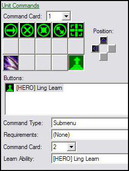 Now, as in Warcraft 3 the hero learning tab has an own tab, we’ll do the same here: select the button position at the bottom row, last column and press the little green ‘+X’. Pick the button you made to go from this tab to the hero learning tab (the ‘Hero tab button’ we made earlier). Now set its ‘Command Type’ to ‘Submenu’, keep ‘Requirements’ at none, set ‘Command Card’ to 2 (currently we’re working at sheet 1) and set ‘Learn Ability’ to our learning ability. This button is done now.